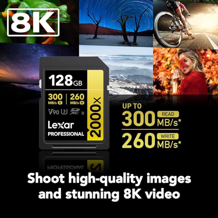 Carte Lexar Professional 2000x 128GB V90 UHS-II SDXC, ultra-rapide pour vidéos 8K/4K et photos RAW, idéale pour les créateurs exigeants.